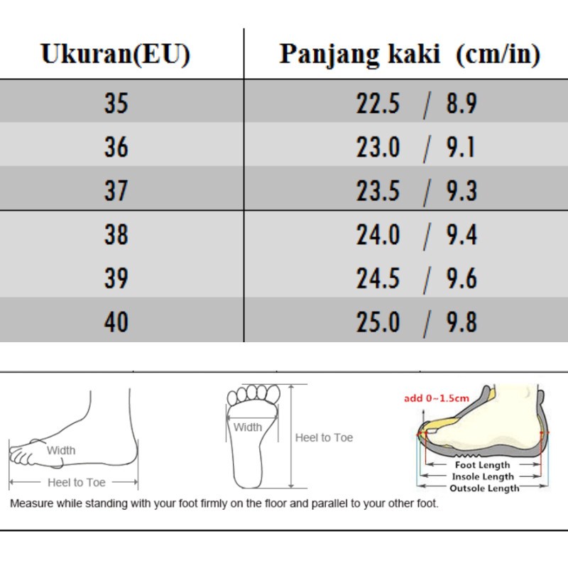 Kami menyarankan anda memilih ukuran sepatu berdasarkan panjang yang paling dekat dengan ukuran kaki anda.